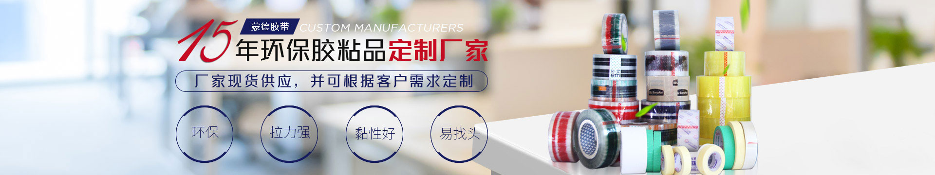 公司始終堅持“全力打造專業化、標準化膠粘產品生產企(qǐ)業”的企業宗旨。目前主(zhǔ)要產品有BOPP透明(míng)膠帶,超(chāo)透明辦公(gōng)膠帶、彩色膠帶、印字膠帶、文具膠帶、美紋(wén)紙膠帶、雙麵膠帶、泡棉雙麵膠帶、大棚(péng)PE修補(bǔ)膠帶、電工膠帶、地毯專用布(bù)基膠帶、PVC警示膠帶等近百個品(pǐn)種,同時可根據客戶要求定做多種規格和要求的(de)膠粘產品,滿足客戶(hù)一站式采購(gòu)的需(xū)求。所服務(wù)的客戶(hù)遍及建材、食品、服裝、電(diàn)子產品、汽車美容(róng)噴漆、醫藥、消(xiāo)毒液、化工、家(jiā)居家裝(zhuāng)、五金小(xiǎo)商品(pǐn)、電商物流、快遞(dì)打包 、農(nóng)副產品服務等多個領域和行業(yè),銷售網絡遍布全國各地。